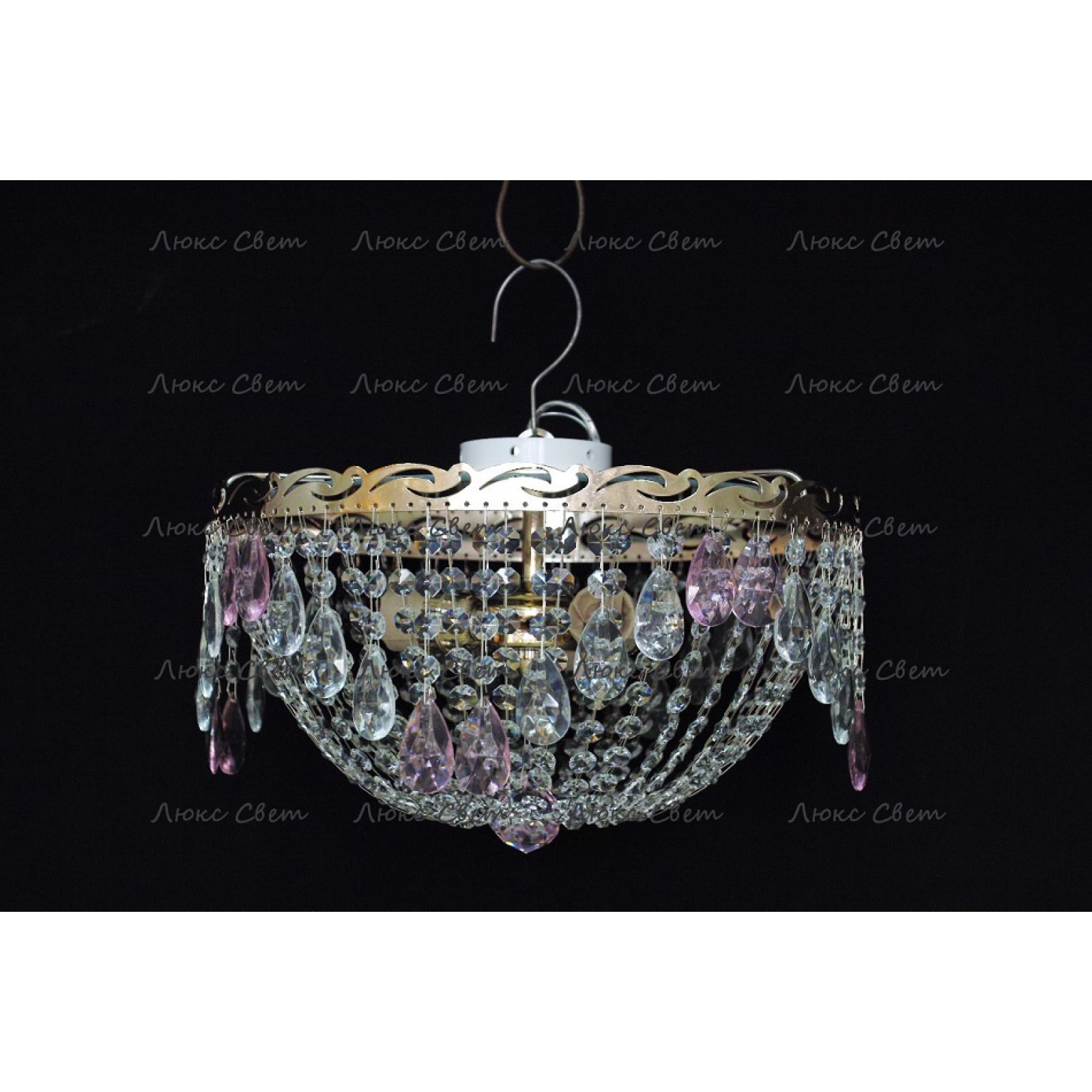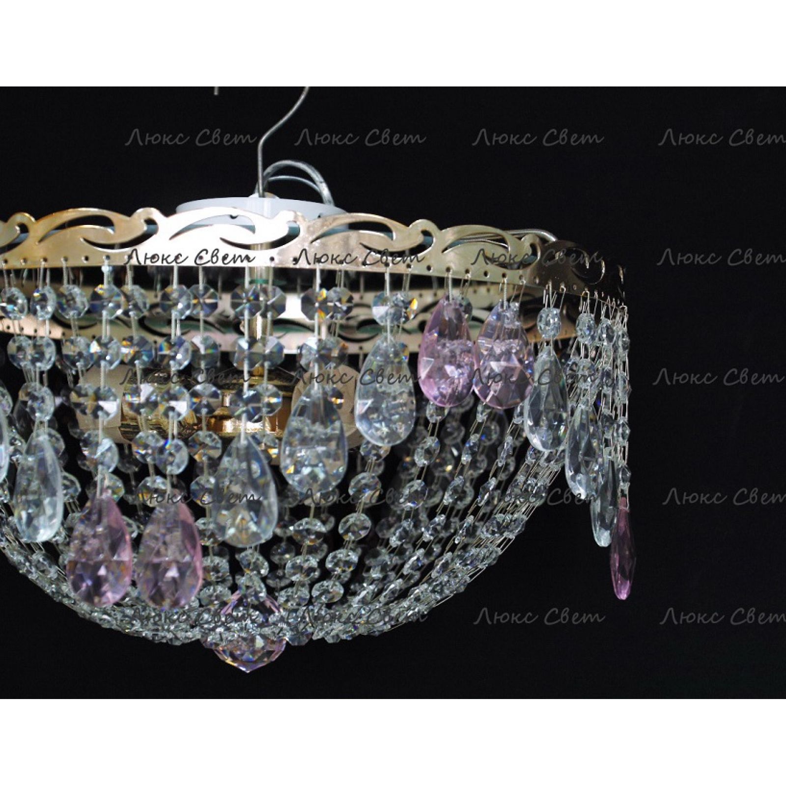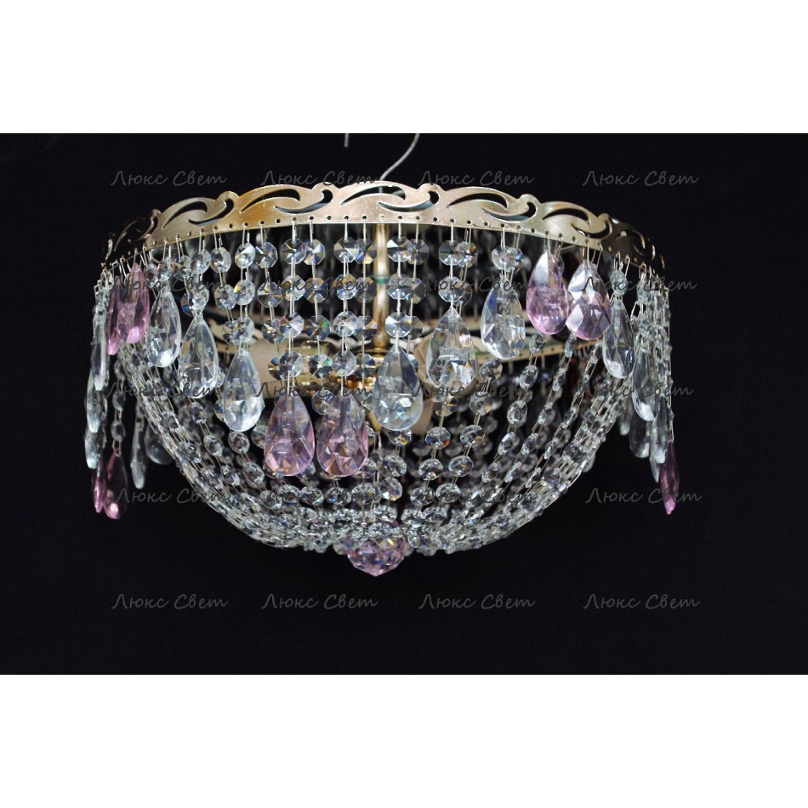 Потолочная люстра Анжелика журавлик с подвесками розового цвета от российского производителя светильников Гусь-Хрустальный идеально подойдет для освещения зала, гостиной, спальни. Люстра выполнена в классическом стиле с изящными хрустальными подвесками. Арматура светильника выполнена из металла, цоколь - E27. Цвет арматуры - золотой или серебристый, на выбор. В основании люстры расположено зеркало, которое отражает свет и усиливает освещенность комнаты.