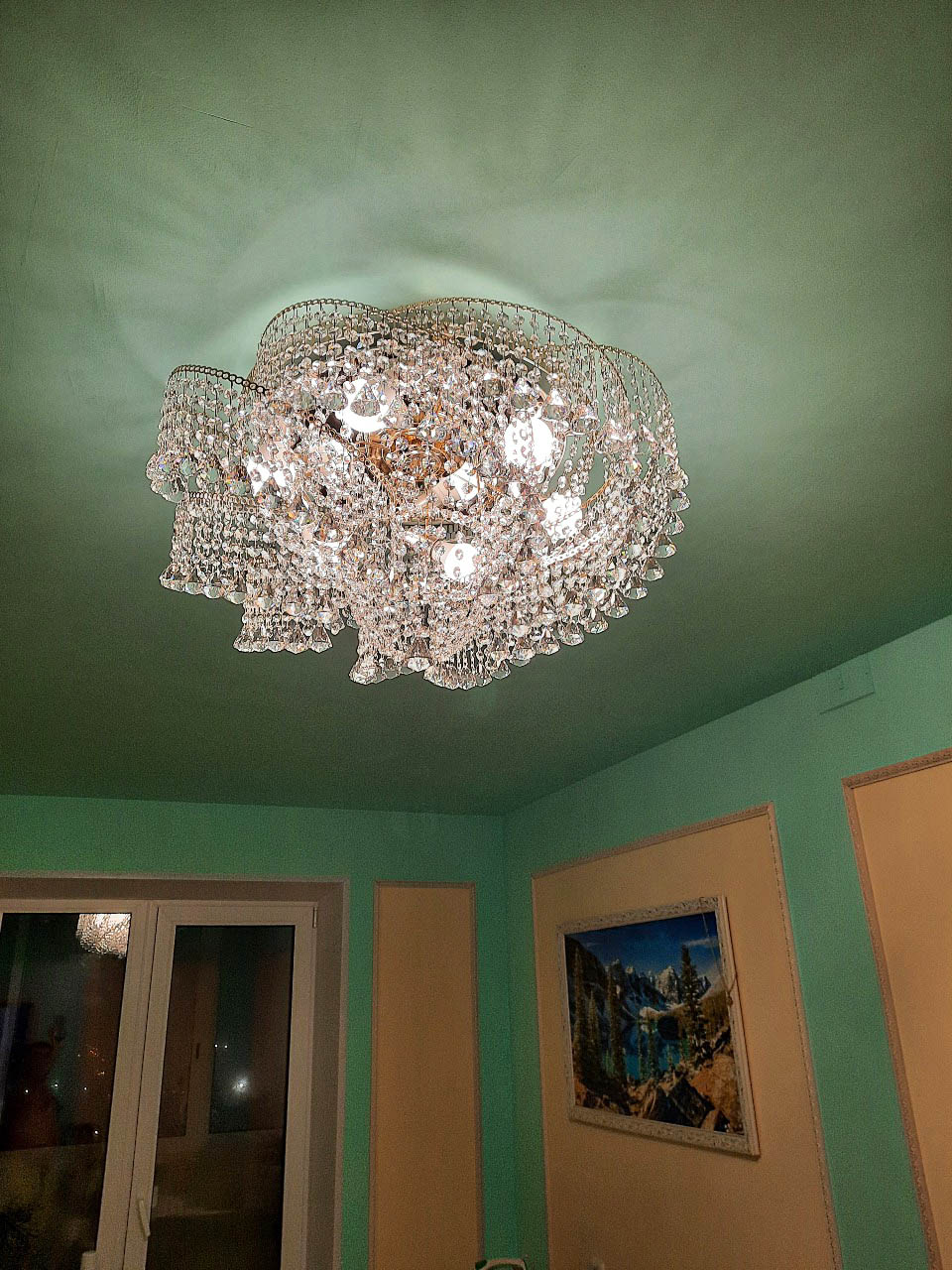 Люстра доехала целая. Очень переживали из за этого, так как ехать к нам далеко. Хрусталики красиво отражают свет. Нам люстра очень понравилась.